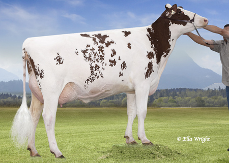 Westcoast Bradnick Allie, a September Bradnick heifer going back to the infamous Tri-Day Ashlyn-ET, All Canadian & All-American 4 Year Old in 2001. Her dam, Butz-Butler Durham Amy-ET EX-95 was the Reserve All-West Mature Cow in 2012 and her Grandam, EO Siemers Ashlyns Angel-ET EX-96 2E was the Res. All-American Sr.2-yr in 2006 and HM. All-Canadian Mature Cow in 2010. Pictured is Allie’s dam, Butz-Butler Durham Amy-ET